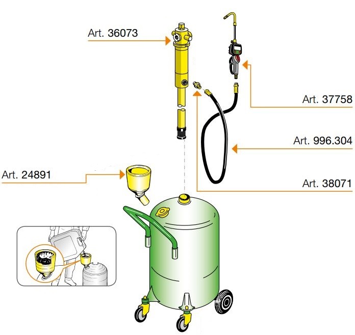 Идеальное сочетание для подачи (заправки) масла в любых рабочих условиях. Бак оснащен двумя закрепленными колесами и двумя поворотными колесами, благодаря чему установка очень удобна в управлении. Воронка с защитой от оттока со специальными краями, позволяющими избежать выливания жидкости на этапе заполнения бака..