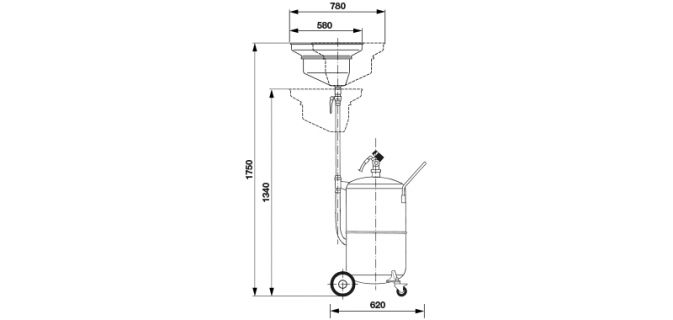 Стандартная пневматическая установка для откачки отработанного масла из автомобиля. Слив отработанного масла производится самотеком с использованием маслосборника (воронки) на 15 литров с регулируемой высотой или откачкой отработанного масла путем отсасывания с помощью щупов, прилагаемых в стандартной комплектации. После создания вакуума в установке она работает самостоятельно, нет необходимости в постоянном подключении к сети сжатого воздуха.