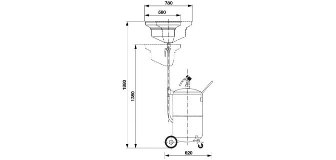 Стандартная пневматическая установка для откачки отработанного масла из автомобиля. Слив отработанного масла производится самотеком с использованием маслосборника (воронки) на 15 литров с регулируемой высотой или откачкой отработанного масла путем отсасывания с помощью щупов, прилагаемых в стандартной комплектации. После создания вакуума в установке она работает самостоятельно, нет необходимости в постоянном подключении к сети сжатого воздуха.