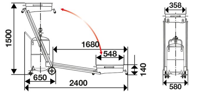 Мобильная установка для слива отработанного масла с подкатной ванной (пантографом) на 14 литров. Регенерация отработанного масла происходит гравитационным методом с помощью подкатной ванны, установленной на полу, или приподнятой, если автомобиль или мотоцикл установлены на подъемнике или над ямой.