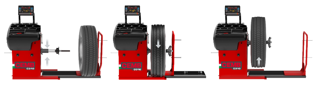 БЕЗПЕЧНЕ ЗАТИСКАННЯ КОЛЕСА ЗАВДЯКИ МОБІЛЬНОМУ ШПИНДЕЛЮ Ніякого ризику для оператора, оскільки підняте колесо вже закріплене на шпинделі, у повній безпеці. |