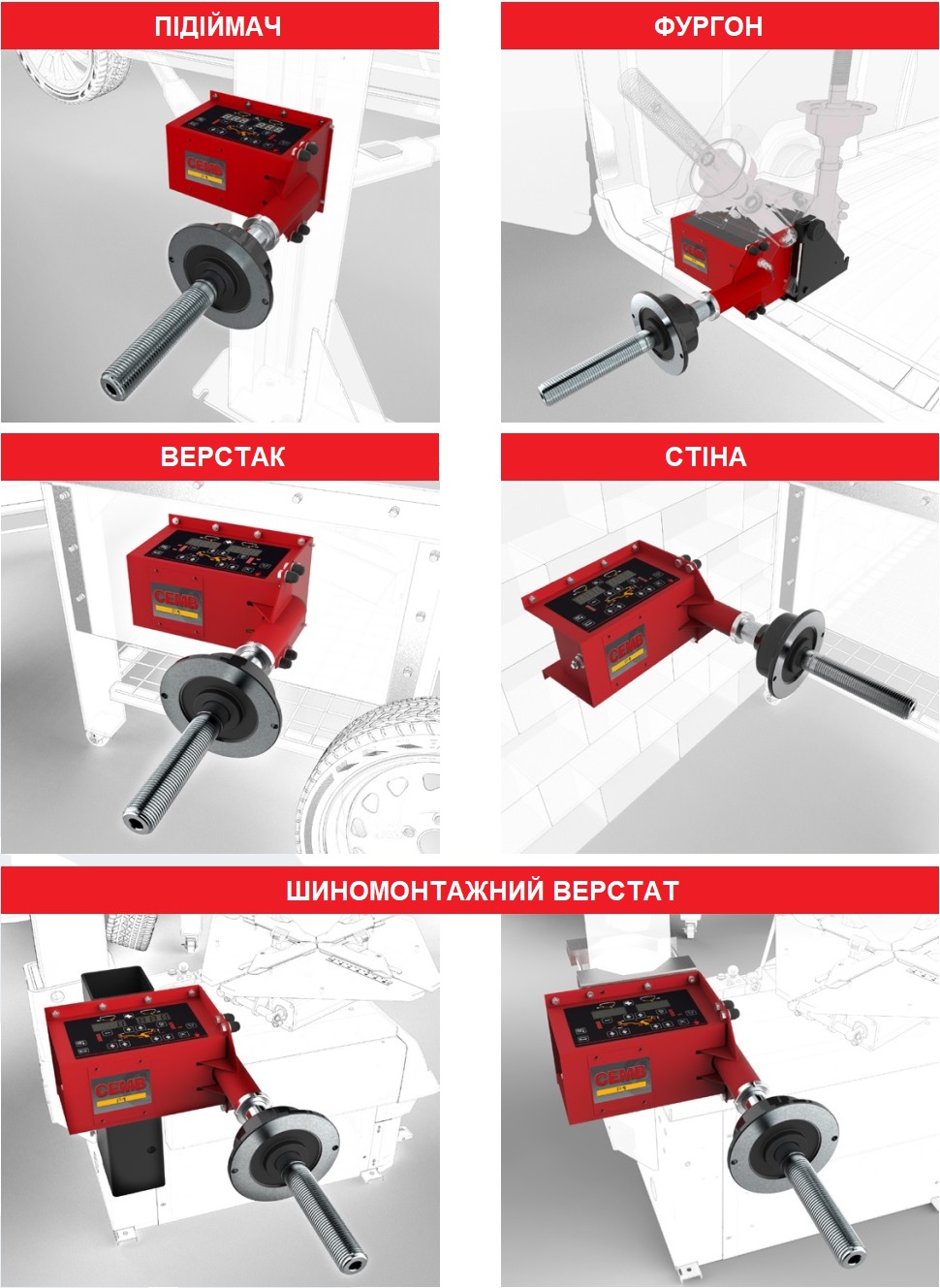 Базова машина підходить для кріплення до стіни або до будь-якої системи, здатної утримувати її міцно. Набір для кріплення до шиномонтажних верстатів CEMB і комплект для кріплення P1 до кузова вантажівки з можливістю перекидання доступні як ОПЦІЯ . Інші системи кріплення доступні за запитом.
