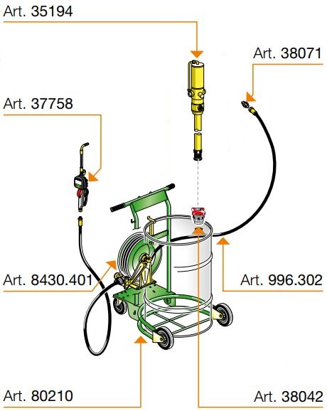 Ідеальна комбінація для подачі (заправки) оливи в будь-яких робочих умовах. Дуже зручний візок оснащений пристосуванням для закріплення бочки (180-220 кг), регульованою бічною опорою для закріплення додаткових пристроїв, колесом з гальмом. Платформа має зручну котушку зі шлангом довжиною 10 м.