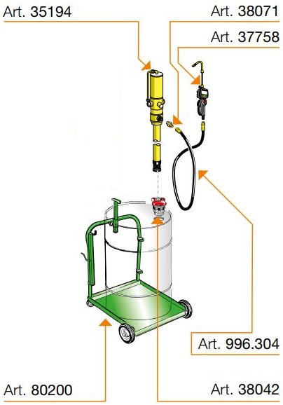 Ідеальна комбінація для подачі (заправки) оливи в будь-яких робочих умовах. Дуже зручний візок оснащений пристосуванням для закріплення бочки (180-220 кг), регульованою бічною опорою для закріплення додаткових пристроїв, колесом з гальмом.