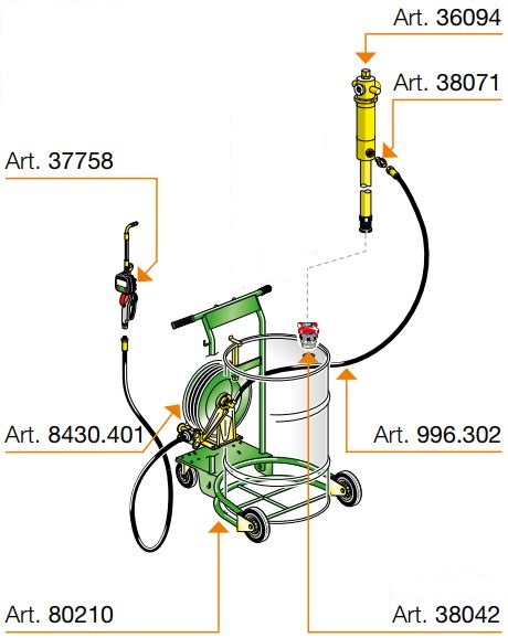 Ідеальна комбінація для подачі (заправки) оливи в будь-яких робочих умовах. Дуже зручний візок оснащений пристосуванням для закріплення бочки (180-220 кг), регульованою бічною опорою для закріплення додаткових пристроїв, колесом з гальмом. Платформа має зручну котушку зі шлангом довжиною 10 м.