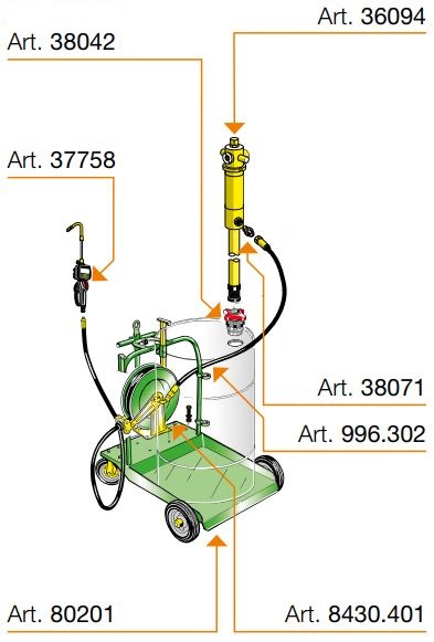 Ідеальна комбінація для подачі (заправки) оливи в будь-яких робочих умовах. Дуже зручний візок оснащений пристосуванням для закріплення бочки (180-220 кг), регульованою бічною опорою для закріплення додаткових пристроїв, колесом з гальмом. Платформа має зручну котушку зі шлангом довжиною 10 м.