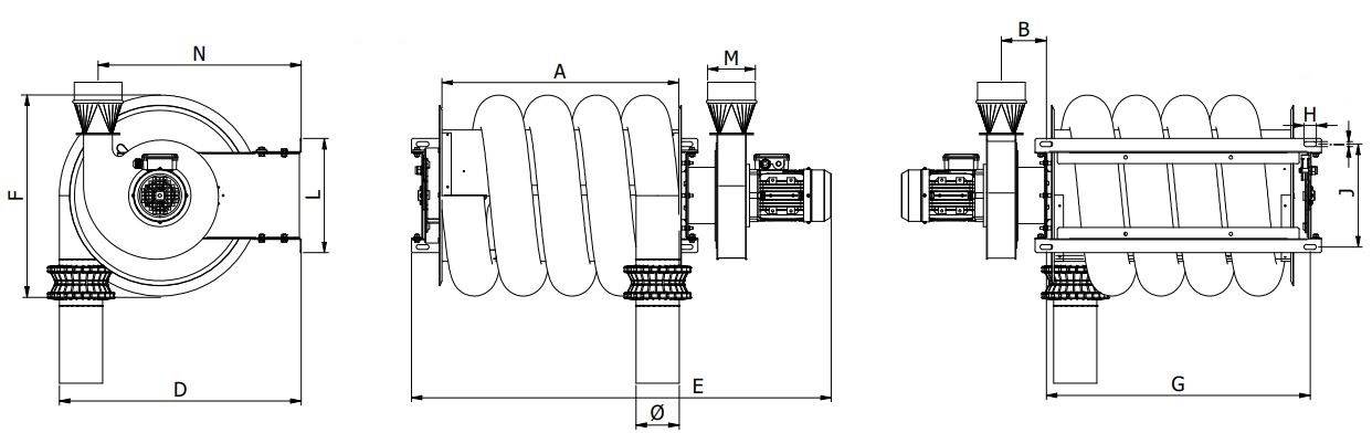 Механічна котушка з трифазним вентілятором 0,37 кВт, 7,5 метровим шлангом Ø 75 мм, стопором для шлангу та гумовою круглою насадкою з отвором Ø 160 мм