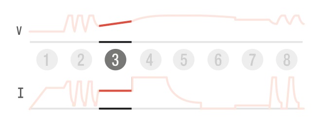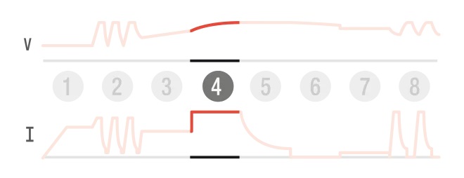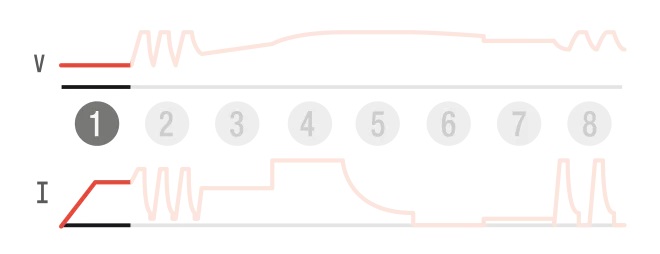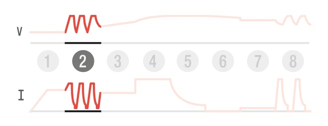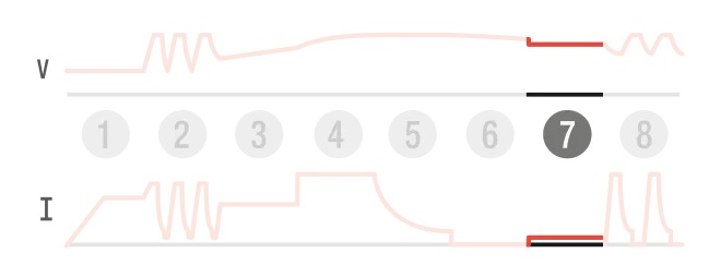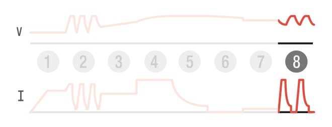 | З практичної точки зору технічне обслуговування батареї, а саме заряджання та підтримка оптимального заряду, відбувається протягом 8 окремих фаз, специфічних для кожного конструктивного типу батареї, причому кожна фаза характеризується особливою функіональністю та формою хвилі. | |||||||||||||||||