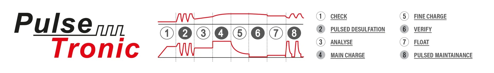 Технологія PulseTronic використовує інтелектуальний моніторинг і спеціальні форми хвиль (імпульси) для підтримки оптимального заряду без перегріву або внесення змін, які пошкоджують хімічну структуру батареї, навіть протягом тривалих періодів (наприклад, технічне обслуговування автомобіля під час періодів простою). Технологія PulseTronic також приділяє особливу увагу безпеці, створюючи та визначаючи правильні умови для повного захисту бортової електроніки автомобіля під час заряджання/технічного обслуговування без від’єднання від автомобіля. Численні переваги цієї технології очевидні навіть під час послідовного або паралельного заряджання кількох акумуляторів. |