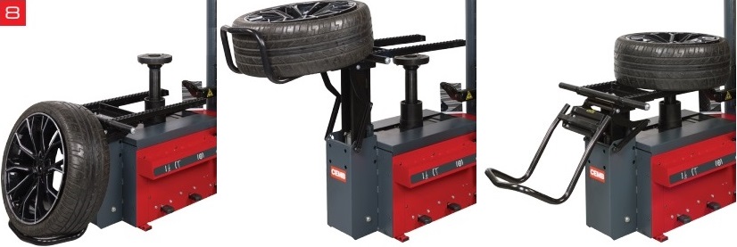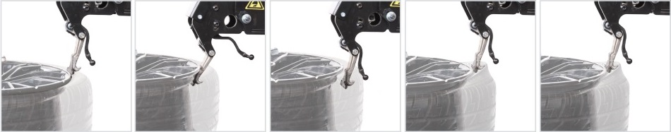 | Комбінований віджим бортів завдяки двом роликовим важелям та їхньому руху вперед. Нижній ролик завжди вирівнюється з інструментом для монтажу/розбирання. Верхній валик, однак, завжди дотичний до центру кола. Обома роликами можна керувати за допомогою спеціальних кнопок автоматичного просування. Нижній роликовий важіль інтегрований в основну структуру рами, що робить його особливо міцним і здатним чинити ще більш ефективний тиск, щоб полегшити віджим нижнього борта шини | |||