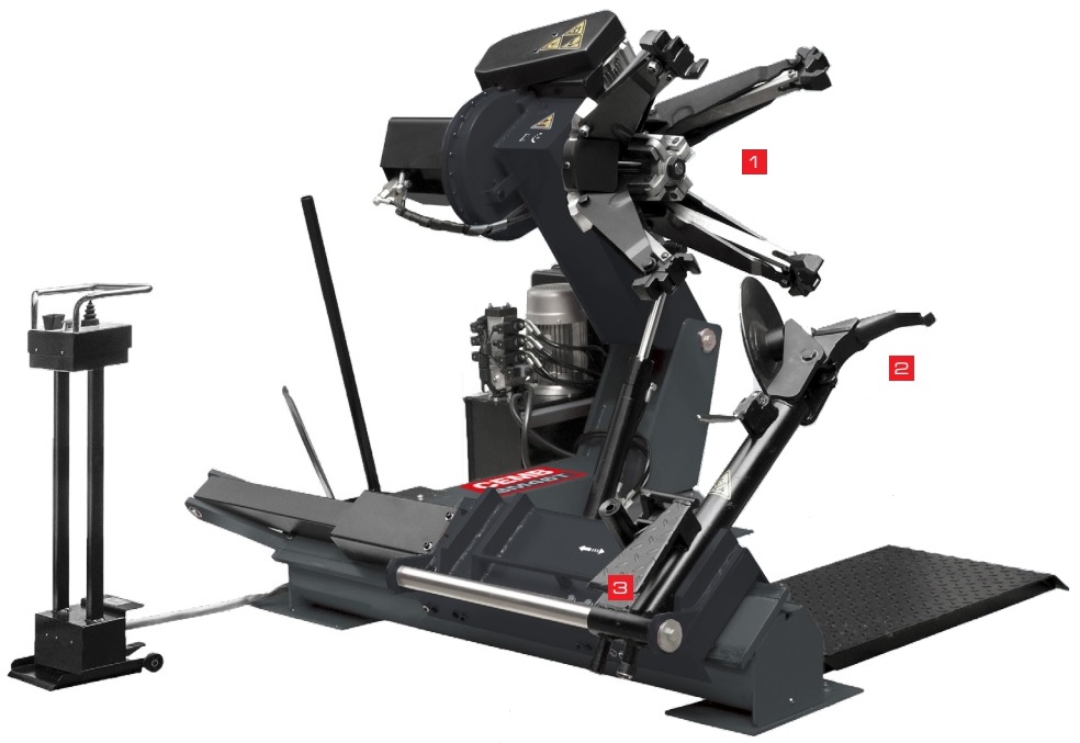Універсальний електрогідравлічний шиномонтажний пристрій для вантажівок, автобусів, сільськогосподарських і землерийних транспортних засобів з максимальним діаметром 2300 мм і максимальною шириною 1065 мм. Напівавтоматичний, з двошвидкісним гідравлічним патроном і пересувним блоком управління з тросом проти здавлювання.