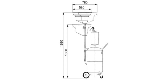 Стандартна пневматична установка для відкачки відпрацьованої оливи з автомобіля. Злив відпрацьованої оливи проводиться самопливом з використанням маслозбірника (воронки) на 15 літрів з регульованою висотою або відкачкою відпрацьованої оливи шляхом відсмоктування за допомогою щупів, що додаються. Після створення вакууму в установках вони працюють самостійно, немає необхідності в їхньому постійному підключенні до мережі стисненого повітря. Прозора передкамера дозволяє контролювати кількість відкачаної оливи.