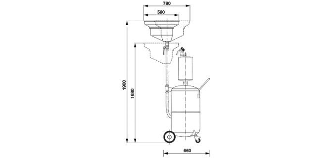 Стандартна пневматична установка для відкачки відпрацьованої оливи з автомобіля. Злив відпрацьованої оливи проводиться самопливом з використанням маслозбірника (воронки) на 15 літрів з регульованою висотою або відкачкою відпрацьованої оливи шляхом відсмоктування за допомогою щупів, що додаються. Після створення вакууму в установках вони працюють самостійно, немає необхідності в їхньому постійному підключенні до мережі стисненого повітря. Прозора передкамера дозволяє контролювати кількість відкачаної оливи.