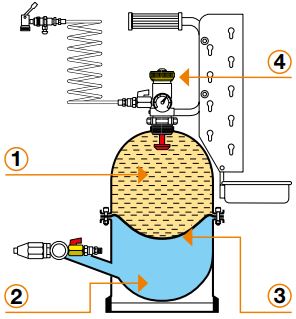 Устройство прокачки тормозной системы оснащено внутренней эластичной диафрагмой (3), герметично отделяет тормозную жидкость, содержащуюся в баке для тормозной жидкости (1), от воздуха, содержащегося в "раздвижном" резервуаре (2), позволяя избежать риска эмульсии (рабочее давление 1-2 бар, который можно контролировать с помощью верхнего манометра). Пробка заливки для тормозной жидкости (4) оснащена указателем запаса, извещающим о том, что тормозная жидкость почти закончилась, и клапаном для выпуска воздуха, используемого на этапе включения устройства.