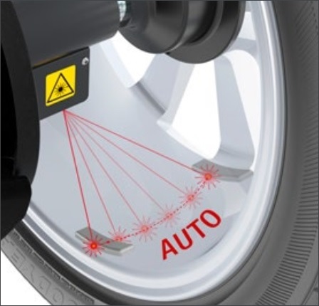 Перемещая колесо вручную, как указано на мониторе, LASER SPOTTER в сочетании с линейным лазером перемещается по ободу, чтобы измерить его размеры без использования "традиционного" датчика диаметра и расстояния. Затем тот же лазер указывает точную точку, куда нужно применить противовесы для коррекции, что делает процесс балансировки еще более эффективным.