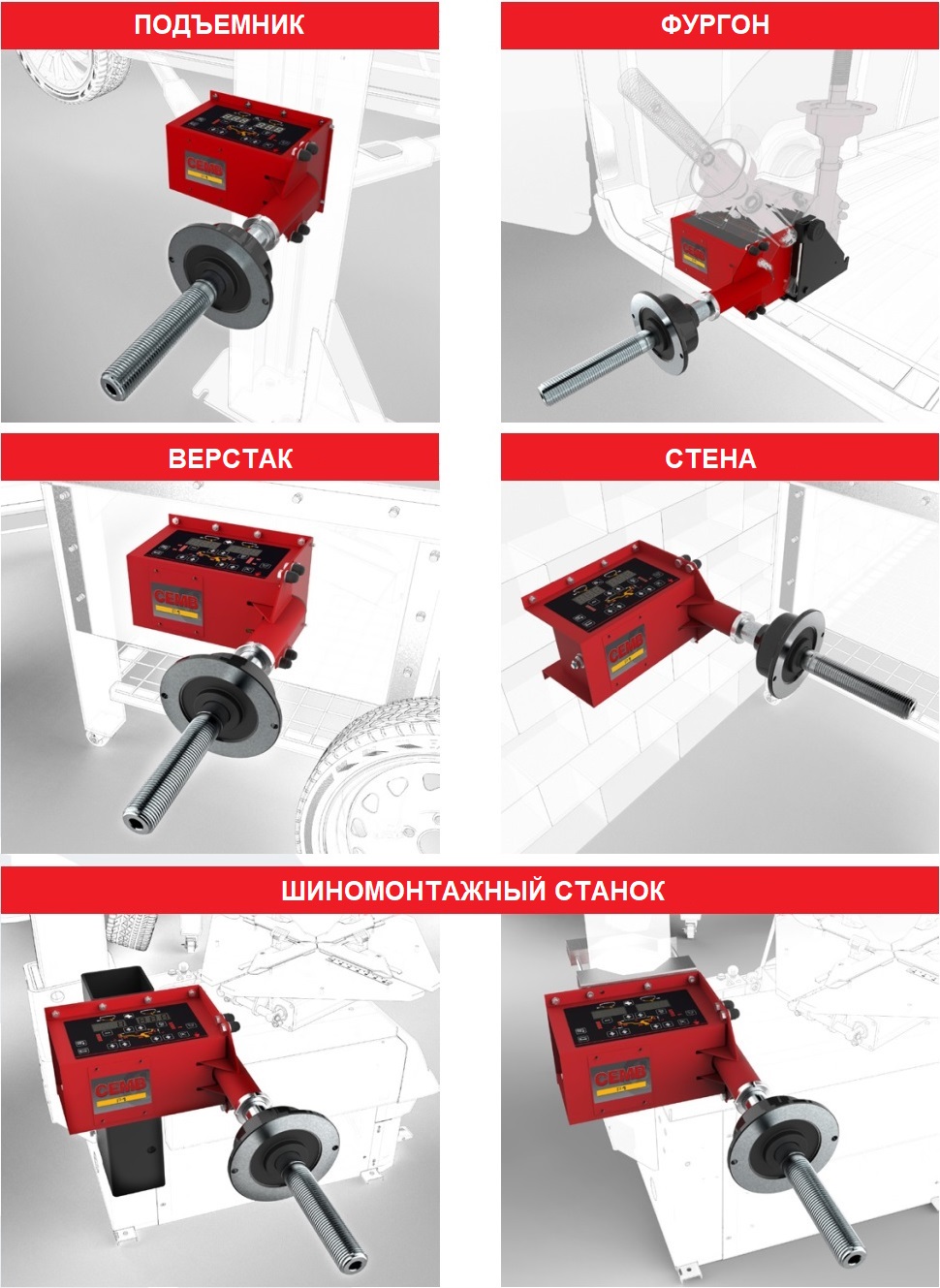 Базовая машина подходит для крепления к стене или любой системе, способной удерживать ее прочно. Набор для крепления к шиномонтажным станкам CEMB и комплект для крепления P1 к кузову фургона с возможностью опрокидывания доступны как ОПЦИЯ. Другие системы крепления доступны по запросу.
