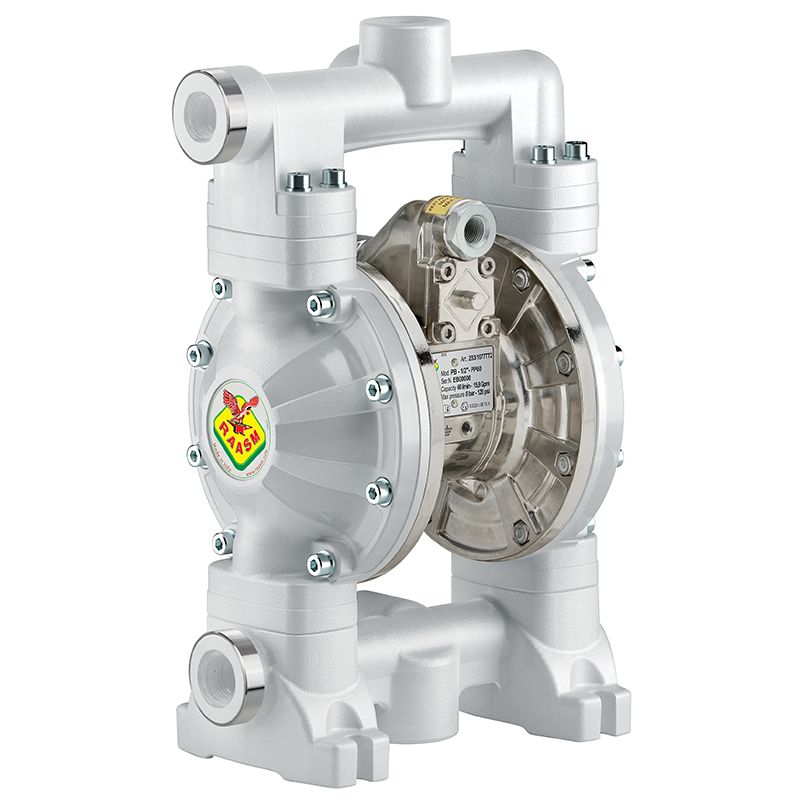 Алюминиевый и полипропиленовый мембранный насос серии APPB-12 с несколькими впускными и выходными отверстиями, диафрагмами и шариками Teflon®, седлами из нержавеющей стали AISI 316 и полипропиленом и шаровыми кранами с пружиной.
