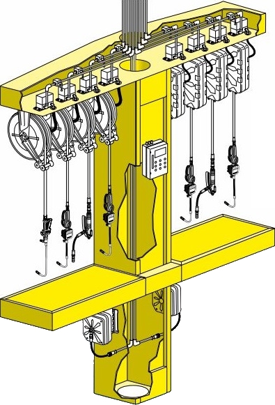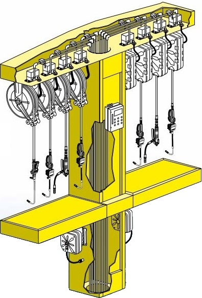 Верхняя часть опоры оснащена отверстиями для установки раздаточных катушек и электроклапанов блокировки жидкости. Впереди можно установить каплесборные бачки. | |