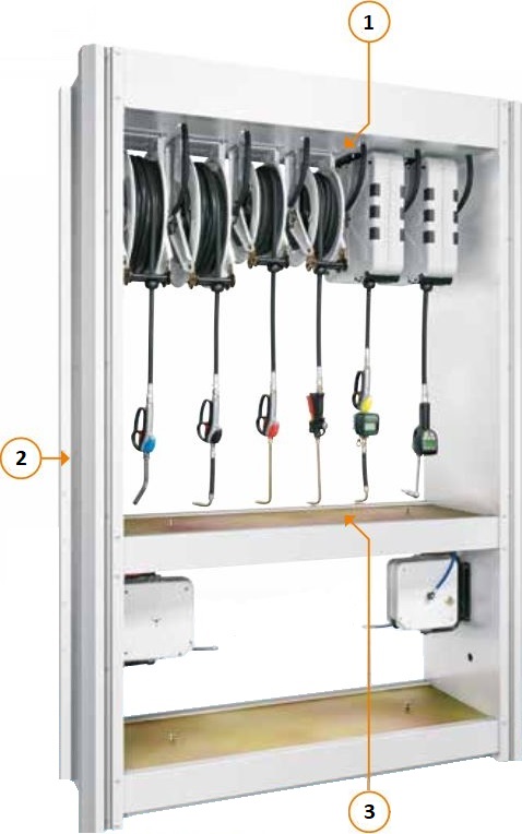 Двухсторонний стенд (сервисная стойка) для раздаточных катушек с емким резервуаром. Позволяет рационализировать рабочее пространство, на котором выполняются хранение и раздача смазочных материалов. Позволяет собирать материал утечек или разлившуюся жидкость с помощью емкого резервуара в соответствии с новыми нормами. Является самой настоящей автономной рабочей станцией, которая изготовлена из высококачественных материалов с покраской стойкой к царапинам.