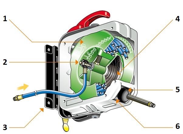 1. Автоматическая система блокировки позволяет зафиксировать шланг на нужной длине 2. Соединения для транспортировки жидкости 3. Настенный кронштейн с байонетным креплением легко монтируется и позволяет быстро снимать катушки при необходимости 4. Пружина перемотки 5. Регулируемый ограничитель шланга 6. Самосмазывающие направляющие ролики шлангов |