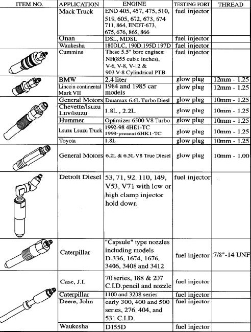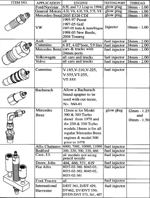 Применение дизельного компрессометра для тяжелых грузовиков: Ford/Navistar, General Motors, Audi, Cummins, Mercedes-Benz, Volkswagen, Volvo, Bacharach, Allis Chalmers, Bedford, Case, J.I., Deere, John, Fiat Allis, Ford Tractor, Interational Harvester, Mack Turk, Onan, Waukesha, BMW, Lincoln continetal, Mark, Peugeot, Chevy Luv, Isuzu, Toyota, General Motors, Detroit Diesel, CAT, Case.