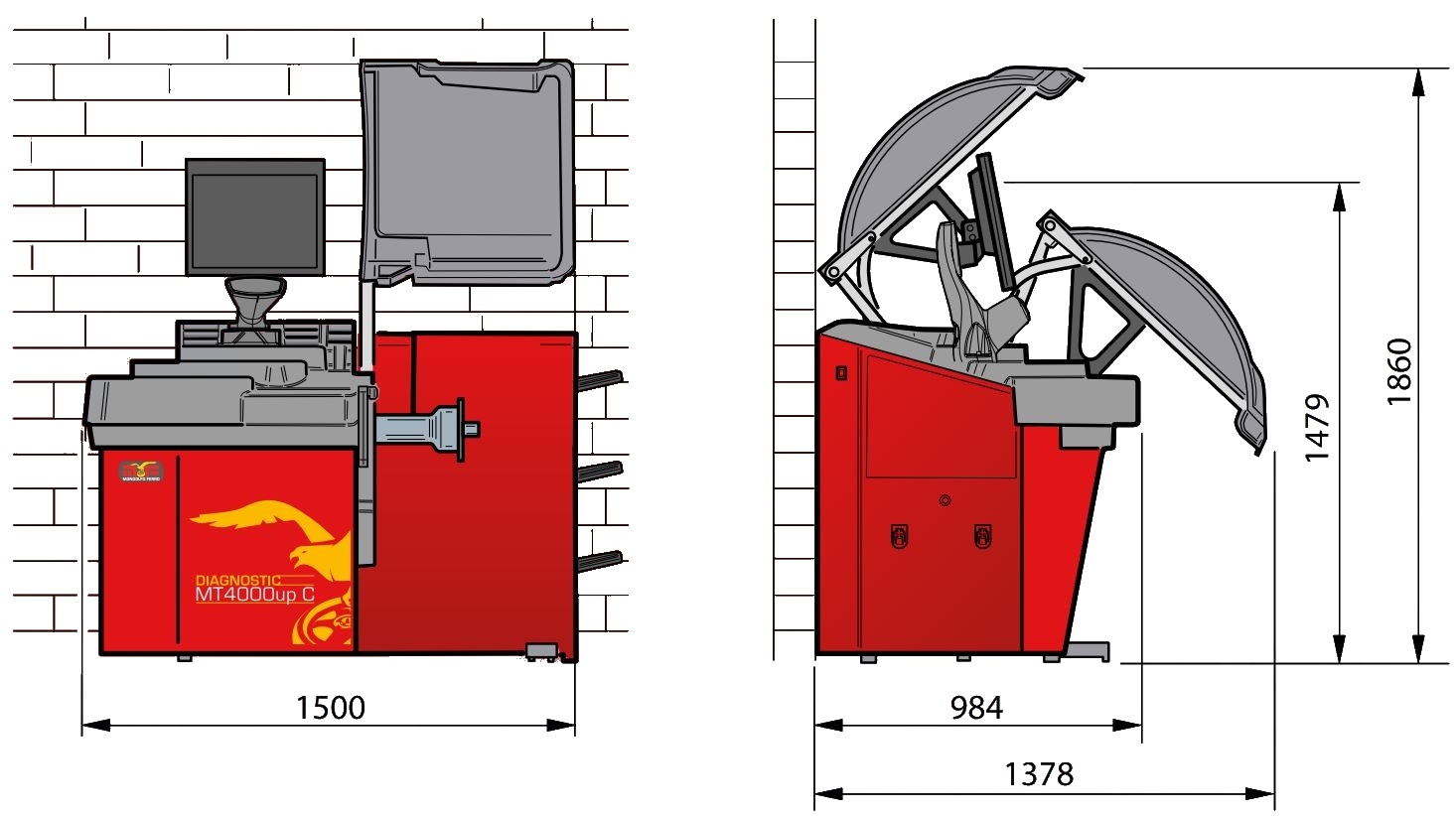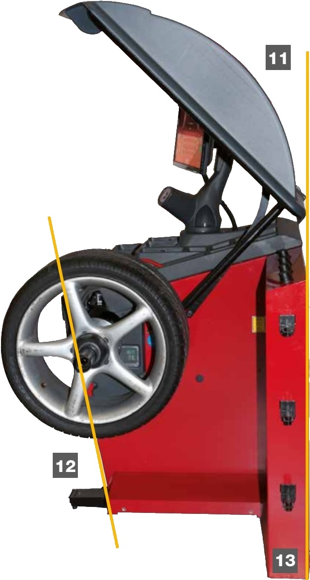 11. ЗАЩИТНЫЙ КОЖУХ, ЭКОНОМЯЩИЙ ПРОСТРАНСТВО Компактный защитный кожух для колес предназначен для размещения вдоль стены. Он также позволяет балансировать колеса с максимальным диаметром до 44 дюймов (1118 мм).