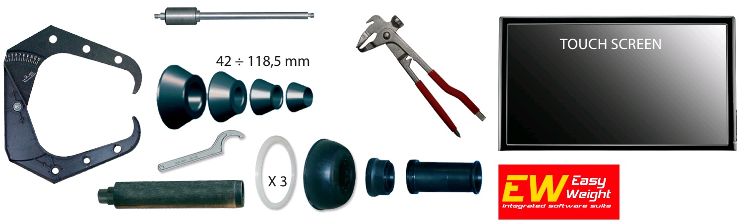 22" сенсорный монитор, комплект центрирующих конусов 4 шт. ∅ 42 - 118,5 мм, балансировочные клещи, электромеханический прижим, прижимная чашка с уплотнительным кольцом, клещи для измерения ширины диска, калибровочный груз.
