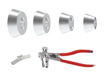 Набор состоит из 4 конусов Ø 45÷111 мм, противовеса 60 грамм и балансировочного молотка.