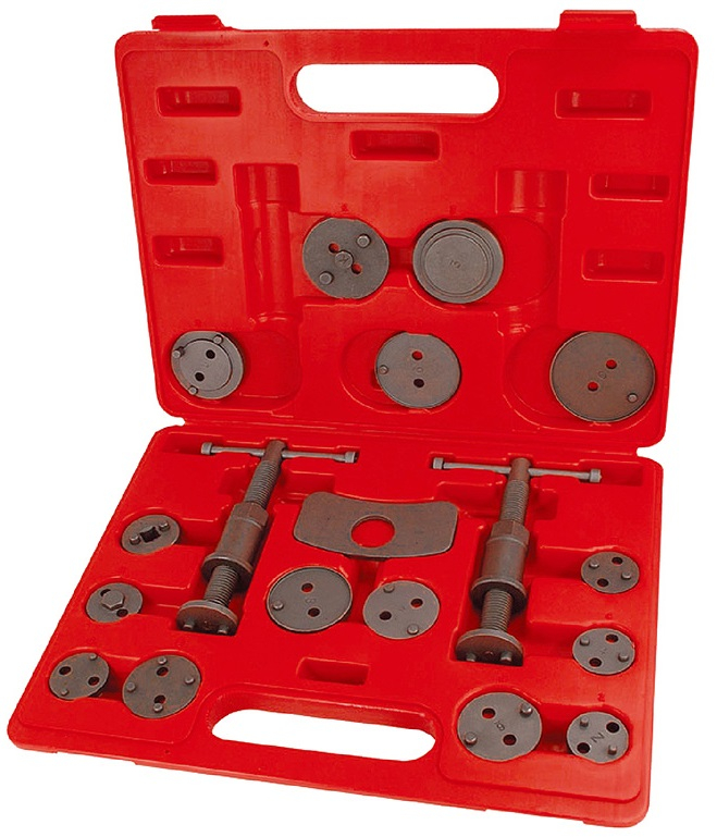 Предназначен для выполнения работ по замене тормозных колодок автомобилей. Пригодится в мастерской или гараже. В комплект поставки входят два утапливающих приспособления с разным направлением вращения стержня (по часовой и против часовой стрелки). Инструмент выполнен из CrMo (хром-молибден) стали, которая обладает высокой износостойкостью и прочностью. Так как приспособления размещены в кейсе, набор удобно транспортировать и хранить.