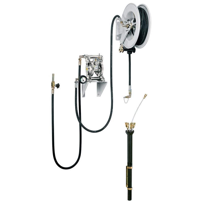 Настенный комплект для всасывания масла и подобных жидкостей, антифриза и других промышленных жидкостей с мембранным насосом серии AB-34 и открытой шланговой катушкой