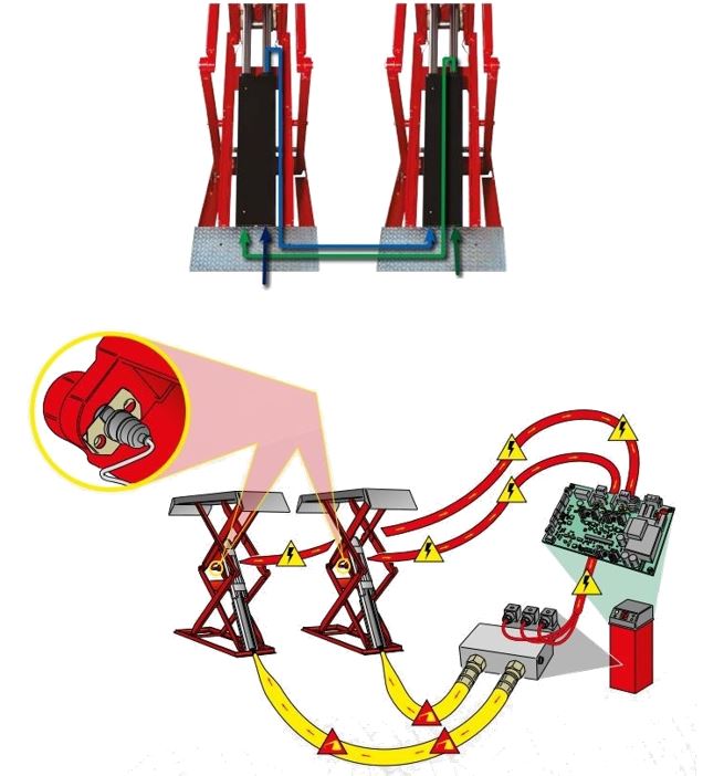 Гидравлическая система выравнивания платформ с двойным ведущим/подчиненным контуром (два цилиндра на каждую платформу) для полной безопасности без необходимости механических стоек для подъемников TITAN X3000F и TITAN X3000FI