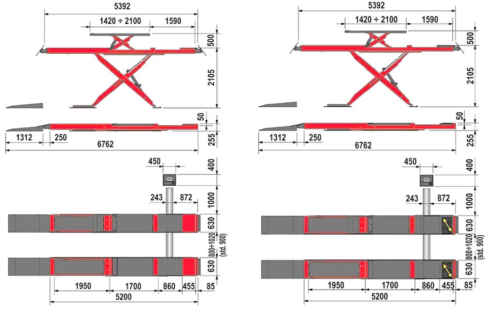 Во всех подъемниках этой серии передняя ось транспортного средства расположена в фиксированной точке подъема (где есть поворотные круги), независимо от колесной базы автомобиля и без какой-либо дополнительной регулировки.