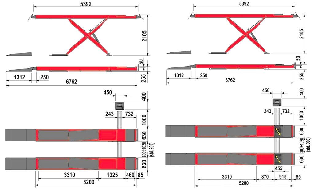 Во всех подъемниках этой серии передняя ось транспортного средства расположена в фиксированной точке подъема (где есть поворотные круги), независимо от колесной базы автомобиля и без какой-либо дополнительной регулировки.