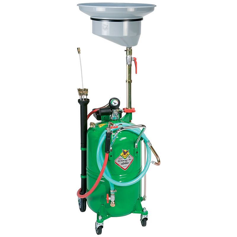 Стандартная пневматическая установка для откачки отработанного масла из автомобиля. Слив отработанного масла производится самотеком с использованием маслосборника (воронки) на 15 литров с регулируемой высотой или откачкой отработанного масла путем отсасывания с помощью щупов, прилагаемых в стандартной комплектации. После создания вакуума в установке она работает самостоятельно, нет необходимости в постоянном подключении к сети сжатого воздуха.