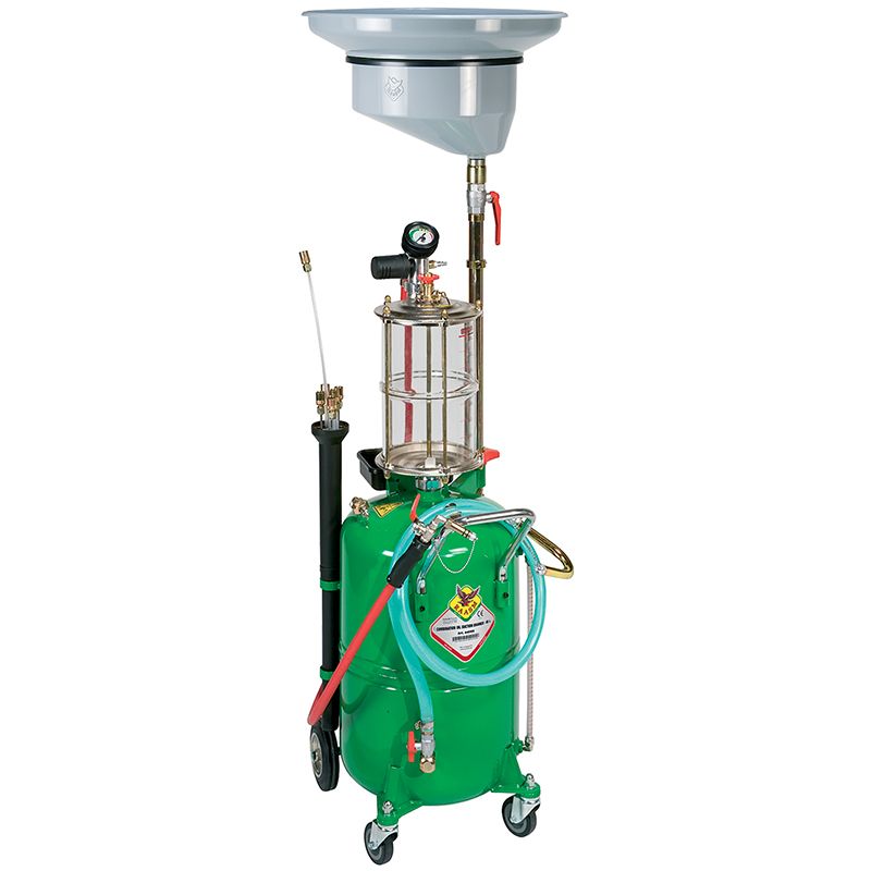 Стандартная пневматическая установка для откачки отработанного масла из автомобиля. Слив отработанного масла производится самотеком с использованием маслосборника (воронки) на 15 литров с регулируемой высотой или откачкой отработанного масла путем отсасывания с помощью прилагаемых щупов. После создания вакуума в установках они работают самостоятельно, нет необходимости в их постоянном подключении к сети сжатого воздуха. Прозрачная предкамера позволяет контролировать количество откачанного масла.