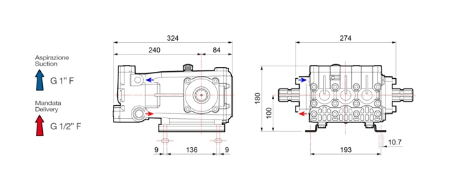 Конфигурация с 3 поршнями скольжения и керамическим цилиндром. Анодированная алюминиевая торцевая часть насоса с двойным анодированием и обработкой методом катафореза. Запатентованная система защиты от износа поршня масла. Всасывание с одинарным соединением.