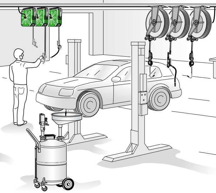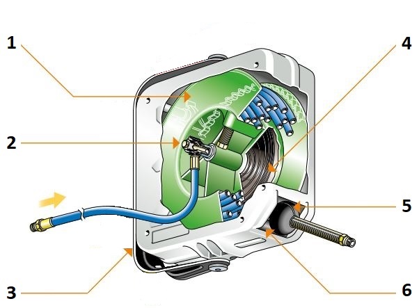 1. Автоматическая система блокировки позволяет зафиксировать шланг на нужной длине 2. Соединения для транспортировки жидкости 3. Простая поворотная настенная опора монтируется как на стену, так и на потолок 4. Пружина перемотки 5. Регулируемый ограничитель шланга 6. Самосмазывающие направляющие ролики шлангов |