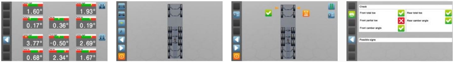 Возможная регулировка двух осей на одном экране | Пошаговая процедура регулировки установки углов до 7 осей | Быстрое измерение передней оси с двумя датчиками | Функция AUDIT для выявления проблем с вождением |