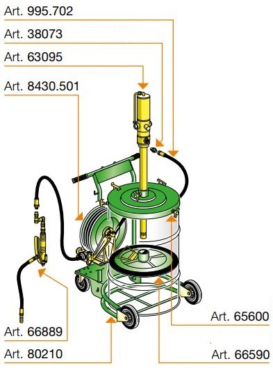 Идеальная комбинация для подачи (заправки) консистентной смазки в любых рабочих условиях. Очень удобная тележка оснащена приспособлением для закрепления бочки (180-220 кг), регулируемой боковой опорой для закрепления дополнительных приспособлений, колесом с тормозом. Платформа оснащена удобной раздаточной катушкой со шлангом длиной 12 метров.