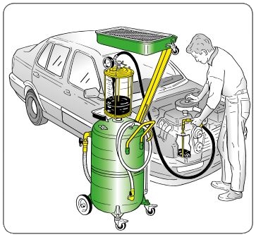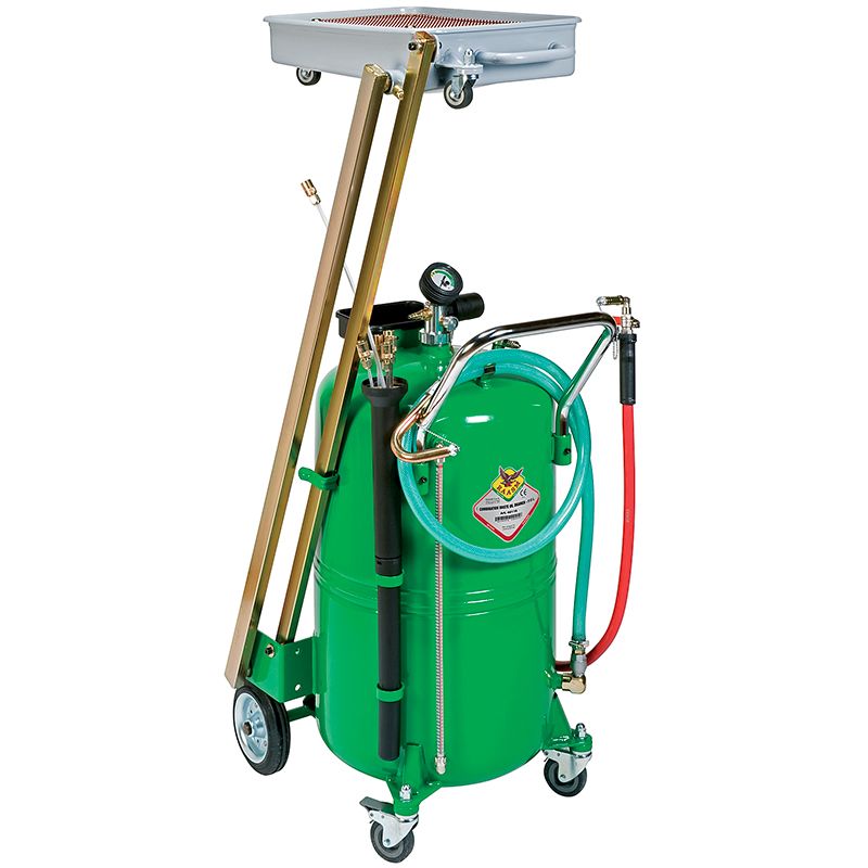 Мобильная установка для слива отработанного масла с подкатной ванной (пантографом) на 14 литров. Регенерация отработанного масла происходит как гравитационным методом с помощью подкатной ванны, установленной на полу, или приподнятой, если автомобиль установлен на подъемнике или над ямой, так и путем откачки с помощью прилагаемых щупов.