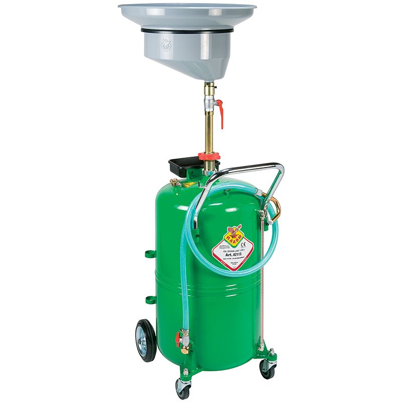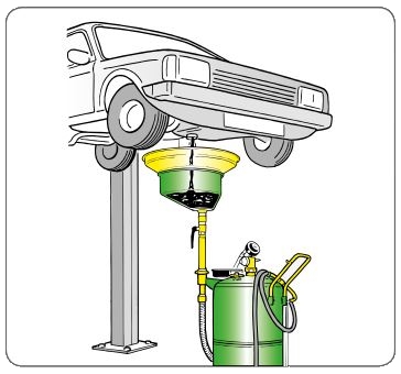 Стандартная установка для слива отработанного масла с автомобиля, вывешенного на подъемнике. Слив отработанного масла производится самотеком с использованием маслосборника (воронки) на 15 литров с регулируемой высотой, установленной на центральной опоре.
