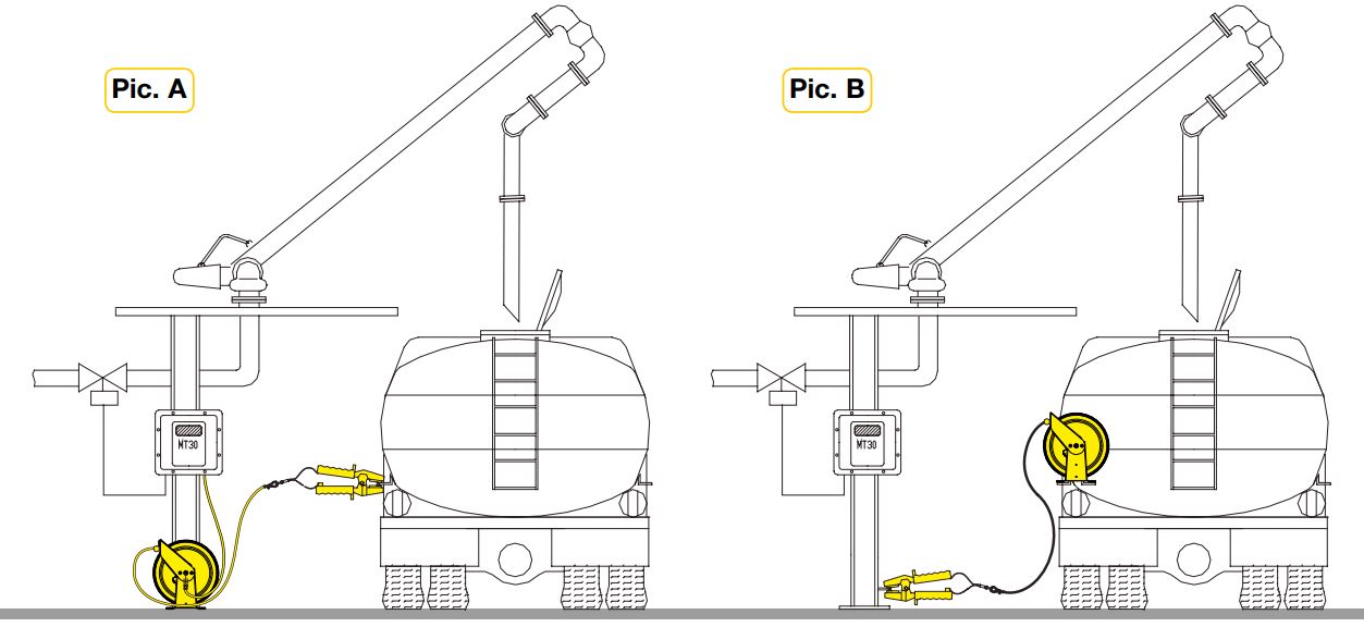 - в качестве альтернативы, раздаточная катушка может быть установлена на подвижной цистерне, а зажим подсоединен к специальной заземляющей пластине (pic. B)