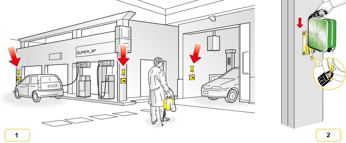 Мал. 1 - Котушка індуктивності для накачування оснащена настінною опорою з автоматичним байонетним з'єднанням (арт. 89001), що дозволяє здійснити її установку або переміщення легко і швидко. Легкість виконання цієї дії дозволяє, в тому числі з метою безпеки, прибрати котушку в закрите приміщення в кінці робочого дня. Крім того, розміщення настінних опор в кожній точці експлуатації, як в приміщенні, так і поза приміщенням, сприяє швидкому переміщенню та встановленню однієї і тієї ж котушки в місці експлуатації, обраному оператором.