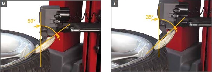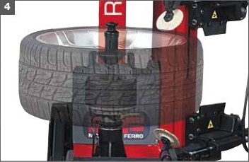 4 Інтегрована фіксація шини, яка дозволяє легко позиціонувати колесо на поворотній платформі без будь-яких зусиль і віджимати два борта одним рухом, не повертаючи обода. 5 - 6 - 7 Блок віджиму бортів складається з двох дзеркальних дисків, що працюють у вертикальному напрямку. Їх можна розташувати радіально за допомогою елемента керування на консолі. Тип системи віджиму є динамічним і забезпечує ідеальний розподіл сил, необхідних для роботи по всьому колу шини, уникаючи ризику пошкодження гуми або обода. Система віджиму надзвичайно ефективна на всіх типах шин завдяки запатентованій системі проникнення віджимного диска, показаній нижче. |
