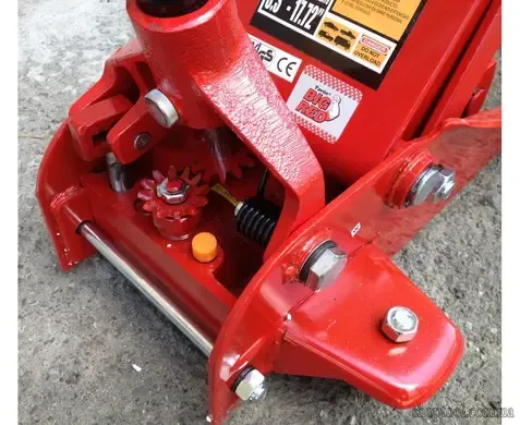Зручний в роботі легко переміщати по робочому майданчику за рахунок великих коліс і довгої ручки, а широка база домкрата робить його стійким, що важливо для безпеки.
