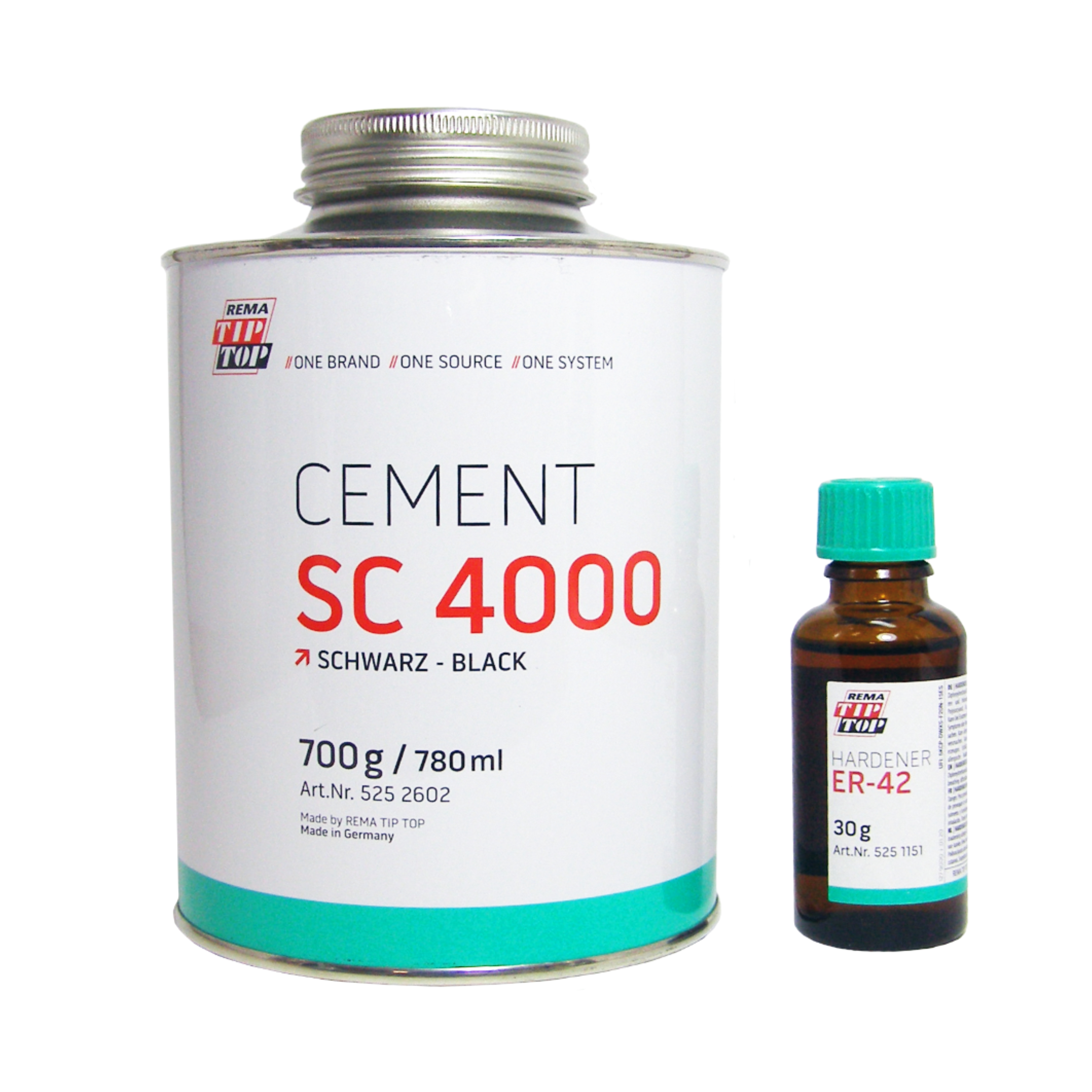 Клей Rema TIP TOP CEMENT SC 4000 у поєднанні з затверджувачем HARDENER ER-42 - це двокомпонентний клей, що містить трихлорэтилена, з відмінною міцністю адгезії та високою динамічною стійкістю для будь - якого роду клейових з'єднань "гума-гума", гума-тканина"," гума-метал"і" тканина- тканина", що застосовується в галузі захисту від зносу та корозії, а також у стрічкових конвеєрах