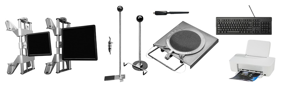 Робочий кабінет, промисловий комп’ютер із операційною системою Windows, 27" та 20" TFT-монітори, кольоровий принтер, USB-клавіатура, WIFI USB-адаптер, чотири 4-точкові затискачі 12"-24" з універсальними кігтями та мішенями, пара механічних поворотних столів, балка з камерами та ручним переміщенням, фіксатор педалі гальма та блокування керма, програмне забезпечення для регулювання коліс та бази даних для легкових автомобілів.