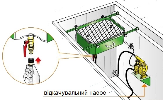Злита відпрацьована олива перекачується з бака регенерації в цистерну зберігання за допомогою відкачуючого насоса, що приєднаний до вбудованої системи.