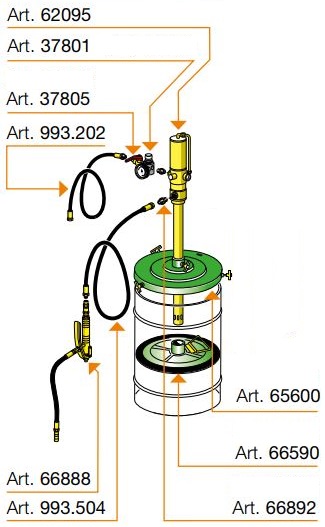 Портативний мастильний комплект для бочок із внутрішнім діаметром від 550 до 600 мм (180-220 кг), насосом R 50:1, діафрагмою, мастильним пістолетом і з’єднувальним шлангом до повітряної системи та регулятором тиску повітря.