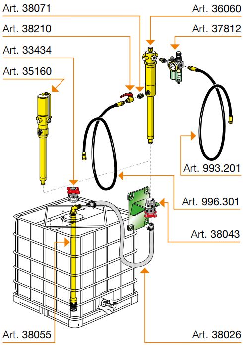 Дане рішення із настінним насосом дозволяє виконати подачу оливи як з підключенням до централізованої установки, так і до роздавальної котушки або безпосередньо до трубки подачі. Вони оснащені пристроями для підключення до системи стисненого повітря та системи подачі (заправки).